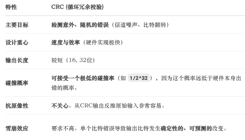 CRC 是高效、轻量级的错误检测码,其安全性建立在随机错误概率 vs 精心设计的多项式特性的数学基础上。