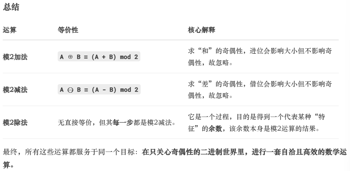 目标:判断一个二进制运算结果的奇偶性。方法一(事后判断):先按常规方式算出结果,然后看这个结果是奇数还是偶数(即结果 mod 21+1=2->2是偶数->。方法二(过程判断):为了高效(特别是在硬件电路里),我们设计了一套新规则,在计算过程中就提前避免处理会影响奇偶性判断的进位和借位。这套规则就是模2运算。例如:按模2规则,1 ⊕ 1直接等于0。“忽略进位和借位”是实现“只关心奇偶性”这一目标的手