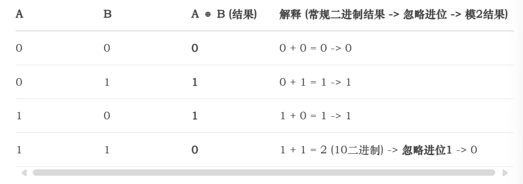 模2加法与逻辑“异或” (XOR) 操作完全相同。