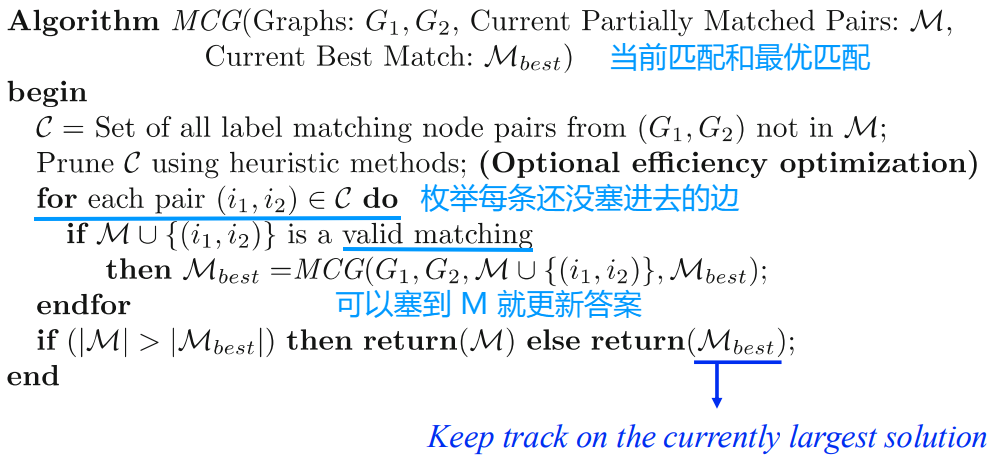 枚举每条边,如果塞进当前的匹配 M 之后还是公共子图,继续dfs 并更新答案。