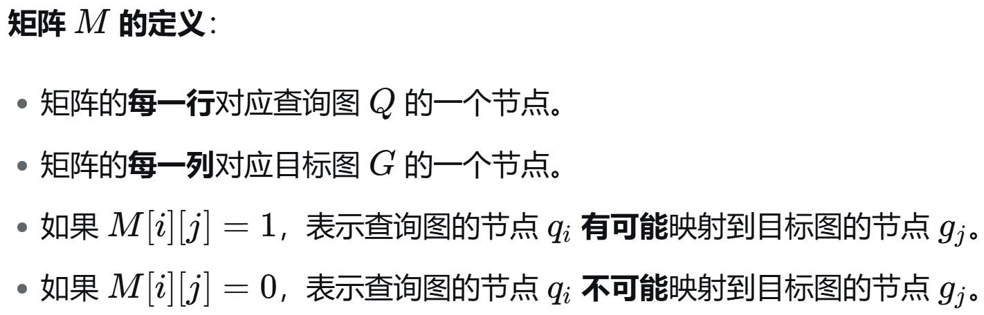 核心数据结构:维护邻接矩阵 M = |Q|*|G| 代表可不可能映射,帮助进行循环搜索和筛选。