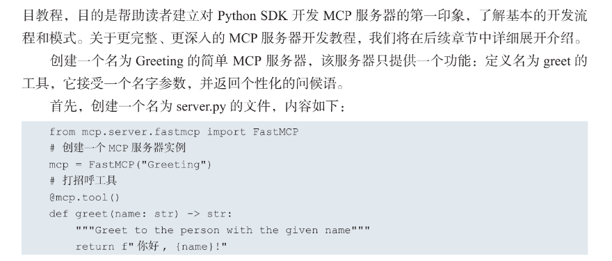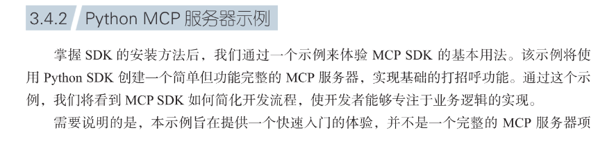 第3章聚焦于MCP开发实践,详细介绍了Python、TypeScript、Java和Kotlin等不同编程语言的MCP SDK的安装方法与环境要求,并通过一个简单的Python MCP服务器示例展示了基本开发流程。