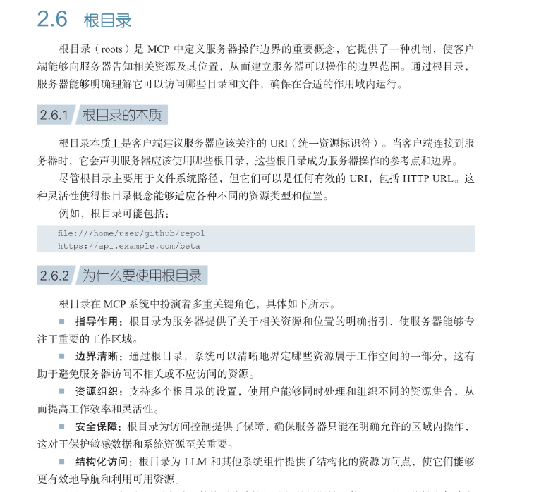 第2章全面介绍了MCP协议的核心技术架构,主要包含以下关键组件:资源、提示词、工具、采样、根目录和传输层。这些组件构成了MCP的基础框架,理解它们对于有效使用和实现MCP至关重要。