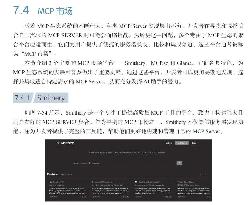 第7章带领读者探索MCP丰富的生态系统,展示各类优秀的MICP Server实现,包括数据库服务、网页内容获取、设计与创意工具、向量数据库以及开发者工具与服务。