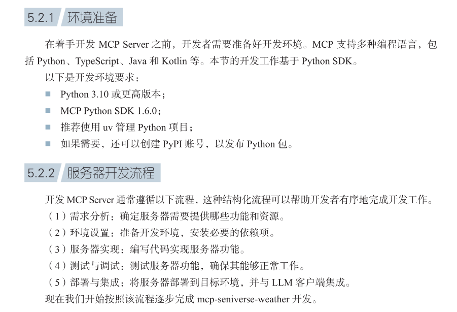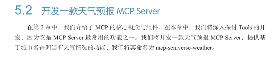 第5章介绍了MCP Server的开发流程、架构设计、功能实现、测试调试和应用集成等方面的内容,并以天气预报MCP Server为例讲解开发流程。