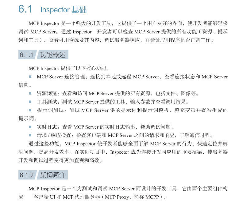 第6章介绍了MCP Inspector工具的使用,包括其基本功能、高级特性、最佳实践和实际应用案例。