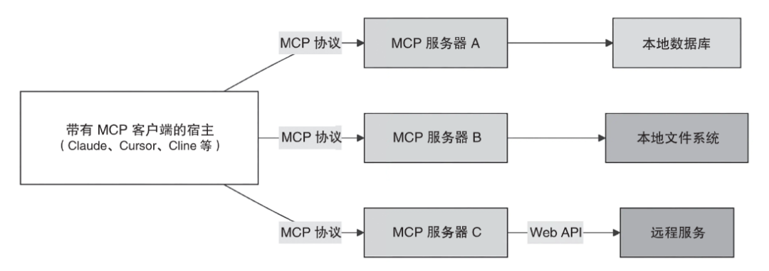 MCP宿主:宿主应用程序包含MCP客户端组件,使用MCP连接各种资源的应用程序,例如AI助手(如Claude桌面应用)、开发环境(如Cursor、Cline)和专门的AI工具。