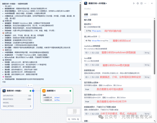 支持markdown和Json格式数据的传入【主要是接收数据库数据】支持Excel文件的直接传入,并且支持多Excel,多Sheet的数据读取和运算具备强大的运算功能,运算结果100%准确(解决了大模型运算不准的问题),可根据用户设定规则、问数需求进行分析运算,并输出运算后的markdown表格信息,可同时生成多个不同维度的运算结果表可生成可视化的图表,柱状图,饼状图,折线图,雷达图,散点图,漏斗