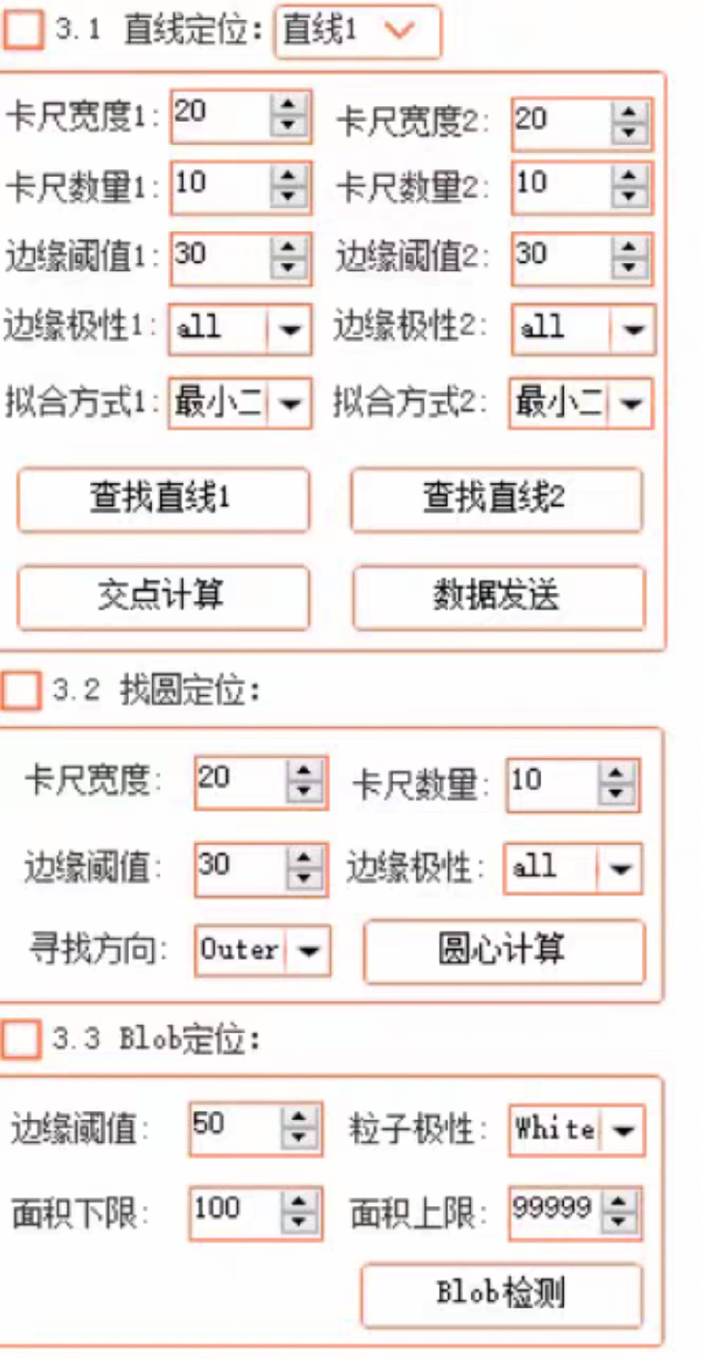 BlobTool,Blob3Tool),支持基于面积、宽高、圆度、凸度等多达十余种形态学特征的粒子筛选,并可输出重心、轮廓、外接矩形等信息。 - 霍夫变换: