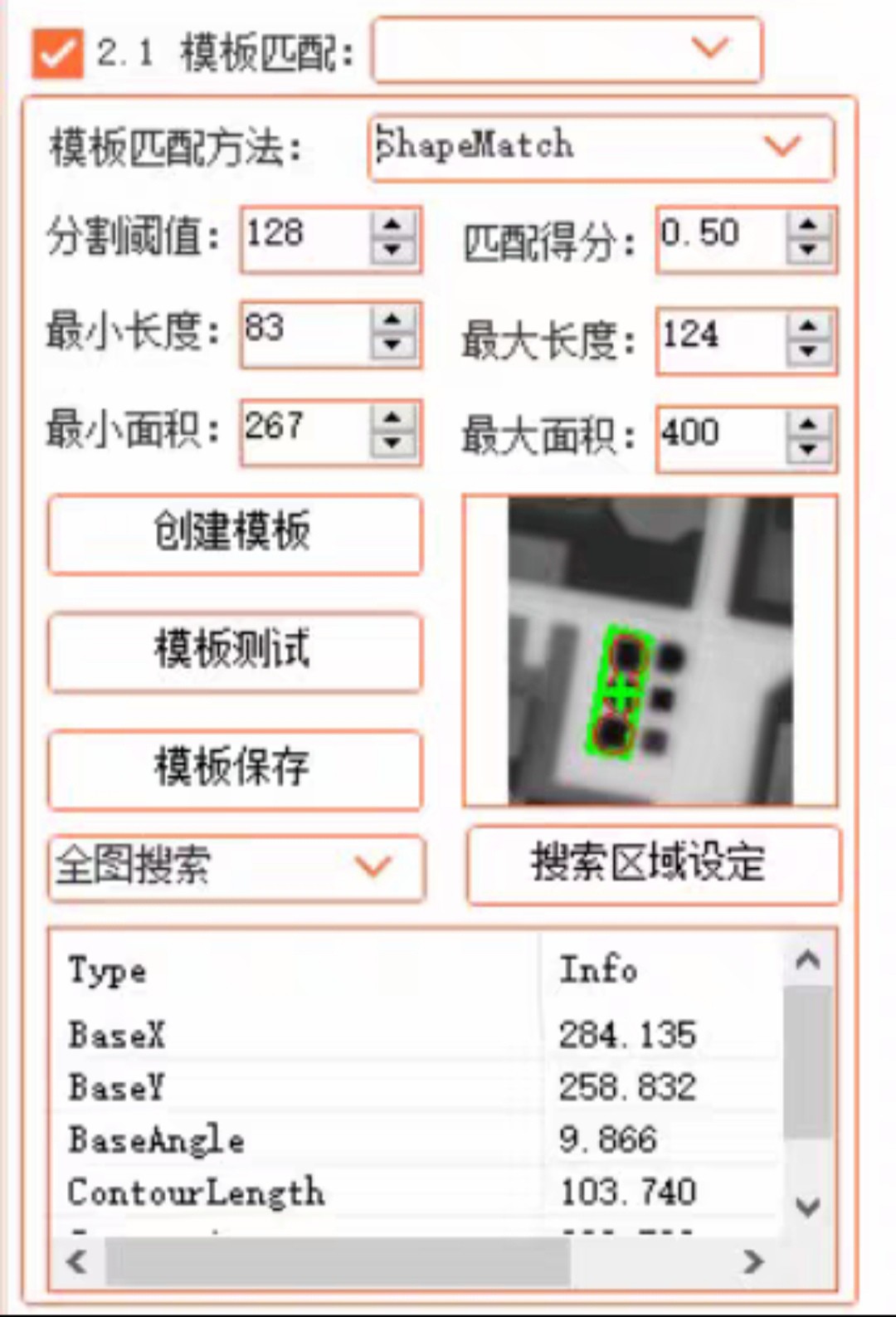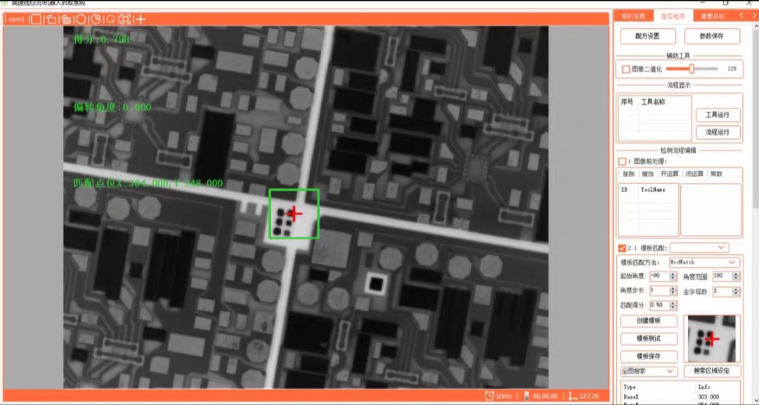 - NCC 模板匹配:基于归一化互相关(Normalized Cross-Correlation),支持多角度、多尺度(图像金字塔)搜索,适用于高精度定位。