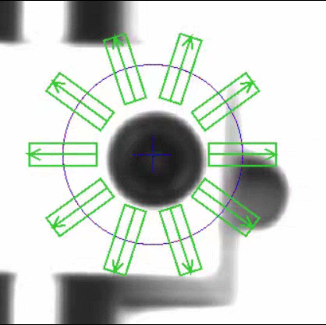 - 直线卡尺工具(LinearCaliperTool):在用户定义的旋转矩形区域内,沿垂直或水平方向进行灰度投影,通过 Sobel 算子查找边缘点。支持多卡尺并行测量,并可使用 RANSAC 算法对边缘点进行直线拟合,有效剔除异常点,提高测量稳定性。