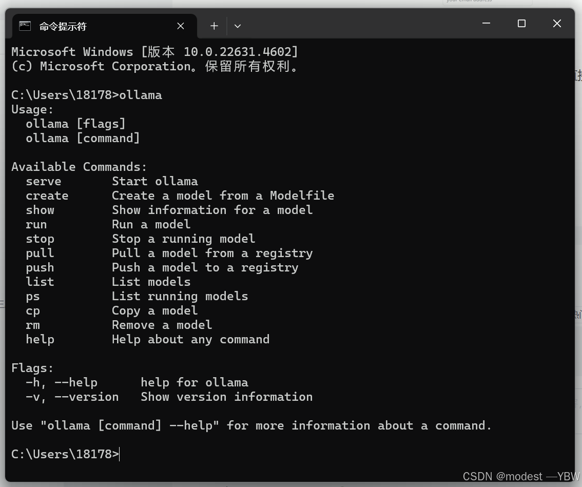 然后下载好,cmd打开命令提示符之后,我们输入ollama可以看到已经安装好了。