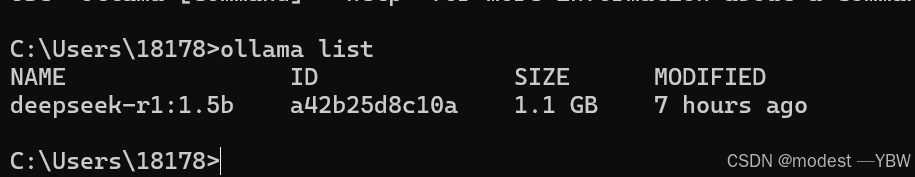 查看模型情况:ollama list 就会显示你现在有什么模型(我们这里是一个1.5b的)