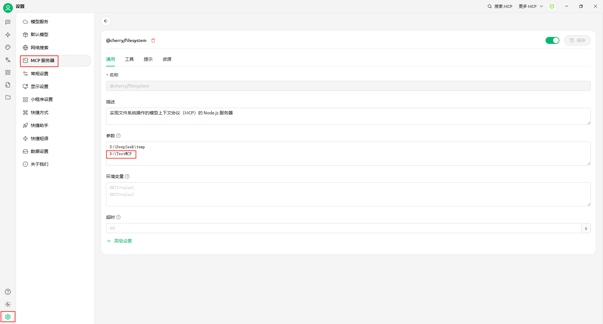 为了完成这个任务,首先需要先在“配置”-“MCP服务器”的“参数”里面,添加“D:\TestMCP”目录。
