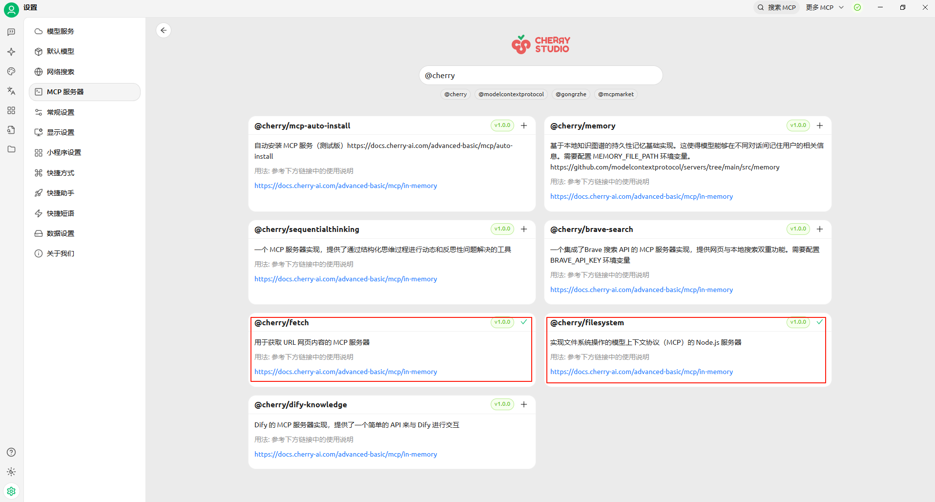 显示出来当前Cherry Studio已经集成的MCP服务,选择“fetch”和“filesystem”这两个服务,然后返回到对话界面。