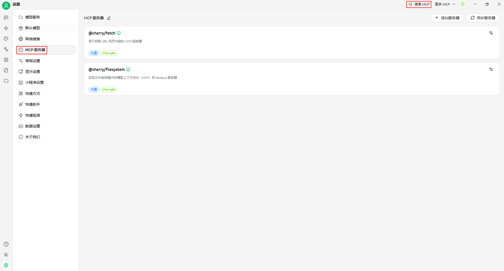 在“设置”点击“MCP服务器”,然后点击右上角的“搜索MCP”。