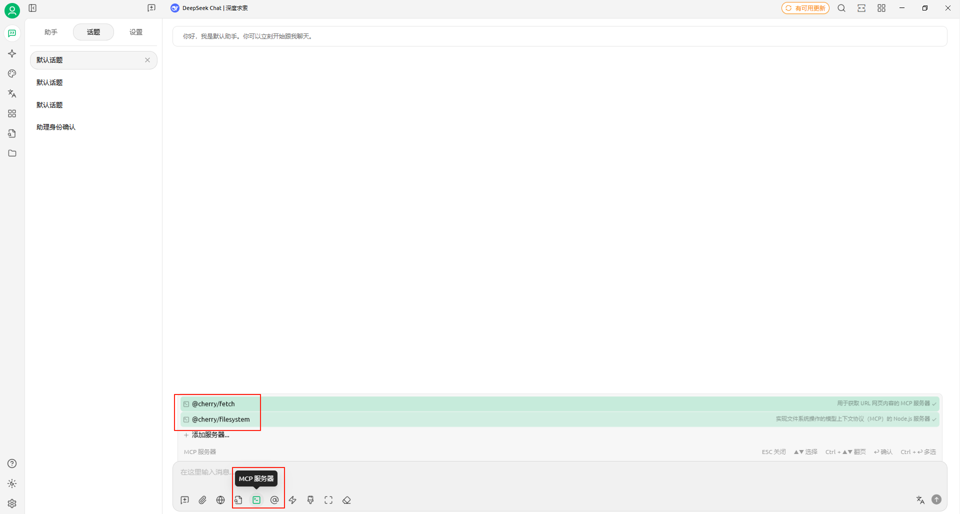 在对话界面的下方,点击“MCP服务器”的图标,然后点击“fetch”和“filesystem”这两个服务左侧的图标,选中这两个服务。