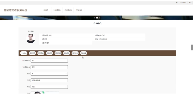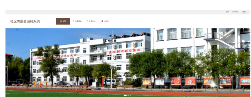 当志愿者通过注册、登录成功后进入系统,首先看到的就是首页界面。在这里,学生能够看到系统的导航条,通过首页、志愿活动、反馈论坛、公告栏、个人中心进入各功能展示页面进行操作,如图5-3所示。