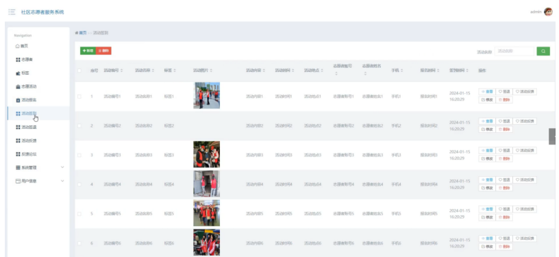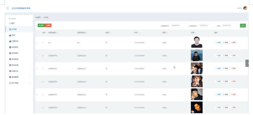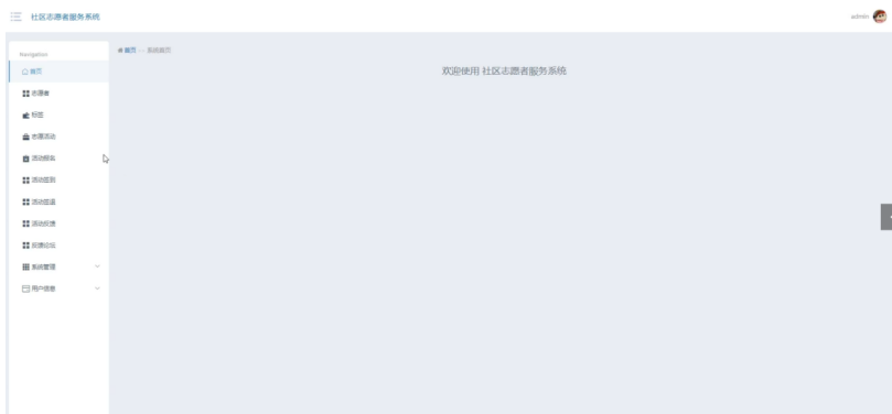 管理员登录进入系统后台可以对首页、志愿者、标签、志愿活动、活动报名、活动签到、活动签退、活动反馈、反馈论坛、系统管理、用户信息等功能进行详细操作,如图5-8所示。