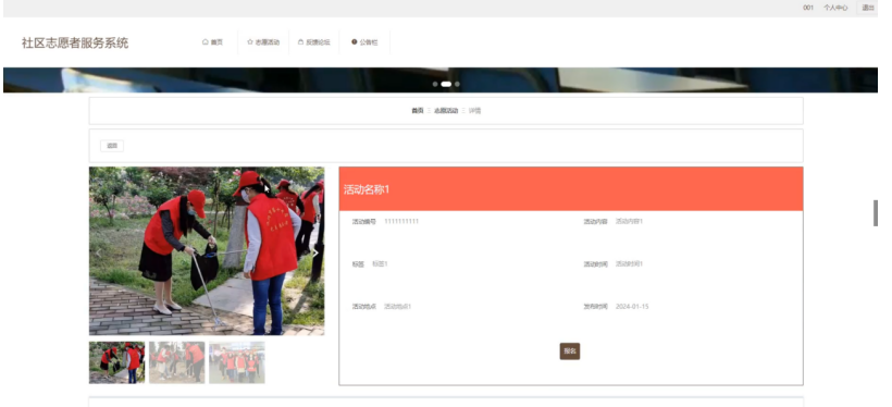 志愿活动:在志愿活动界面输入活动名称,进行查询,可以查看到志愿活动详情信息,还可以点击报名等操作。如图5-4所示。