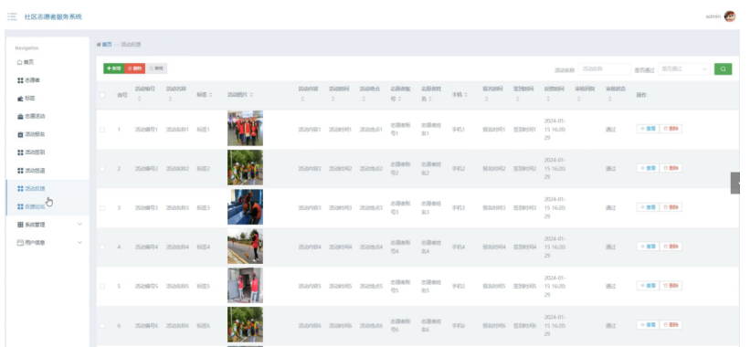 管理员点击活动反馈,在活动反馈页面输入活动名称、是否通过,进行搜索或新增、删除活动反馈,并根据需要对活动反馈详情信息进行新增或删除等操作;如图5-14所示: