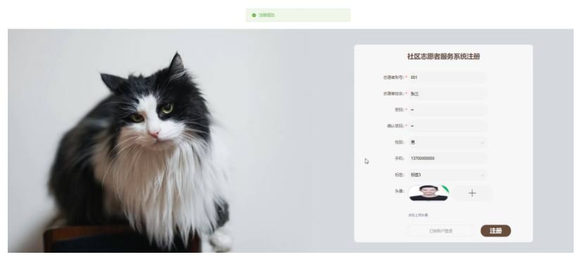 在注册流程中,志愿者在Vue前端填写必要信息(如用户名、密码等)并提交。前端将这些信息通过HTTP请求发送到Java后端。后端处理这些信息,检查用户名是否唯一,并将新志愿者数据存入MySQL数据库。完成后,后端向前端发送注册成功的确认,前端随后通知志愿者完成注册。这个过程实现了新志愿者的数据收集、验证和存储,如图5-1所示。