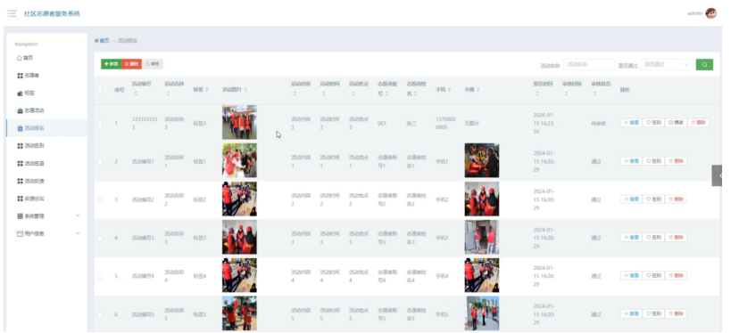 活动报名在视图层(view层)进行交互,比如点击“新增”按钮或填写活动报名需求信息表单。这些活动报名动作被视图层捕获并作为请求发送给相应的控制器层(control1er层)。控制器接收到这些请求后,调用服务层(service层)以执行相关的业务逻辑,例如验证输入数据的有效性和与数据库的交互。服务层处理完这些逻辑后,进一步与数据访问对象层(DAO层)交互,后者负责具体的数据操作如查询、新增、更新或删除活动报名,并将操作结果返回给控制器。最终,控制器根据这些结果更新视图层,以便活动报名可以看到最新的信息或相应的操作反馈。在活动报名页面的输入栏中输入活动名称、是否通过进行搜索,可以查看到活动报名详细信息,并根据需要进行新增或者删除等操作;如图5-11所示: