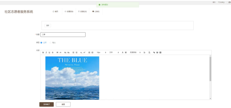 反馈论坛:由志愿者分享自己认为比较好的志愿活动,然后通过填写标题、类型、内容,进行发布帖子,与其他志愿者可以在下方发表评论,可依关键字搜索帖子。如图5-5所示。