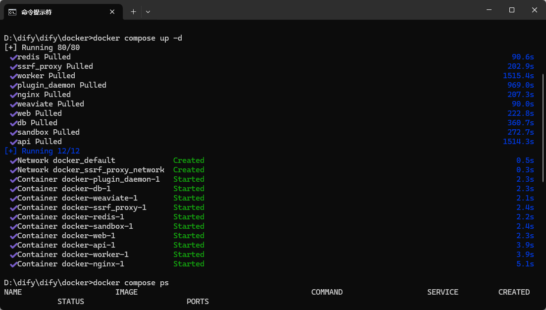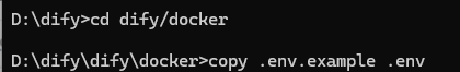 然后开始在Docker中启动Dify,打开CMD命令行,进入刚刚克隆Dify源码的路径: