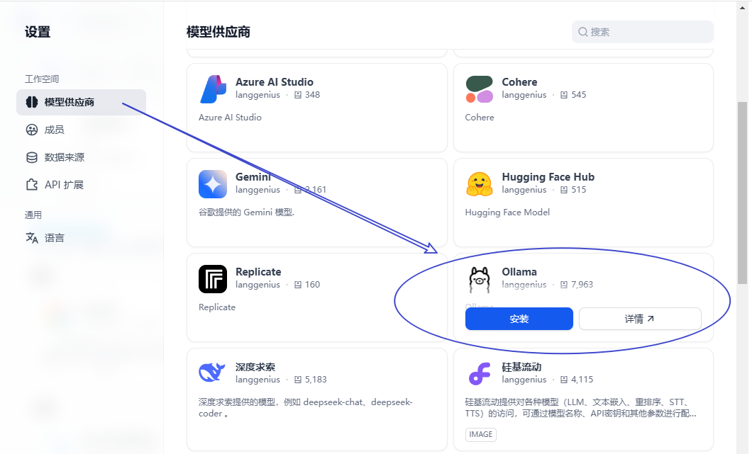 首先打开Dify设置界面,找到并安装模型供应商里面的olloma插件。