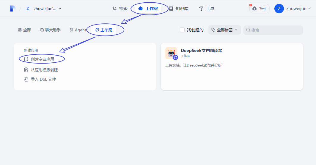 你可以在工作室->工作流->创建空白面板中,创建新的工作流。