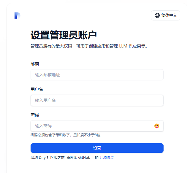 打开后,就会出现Dify的软件界面,需要先设置管理员账号再登陆。