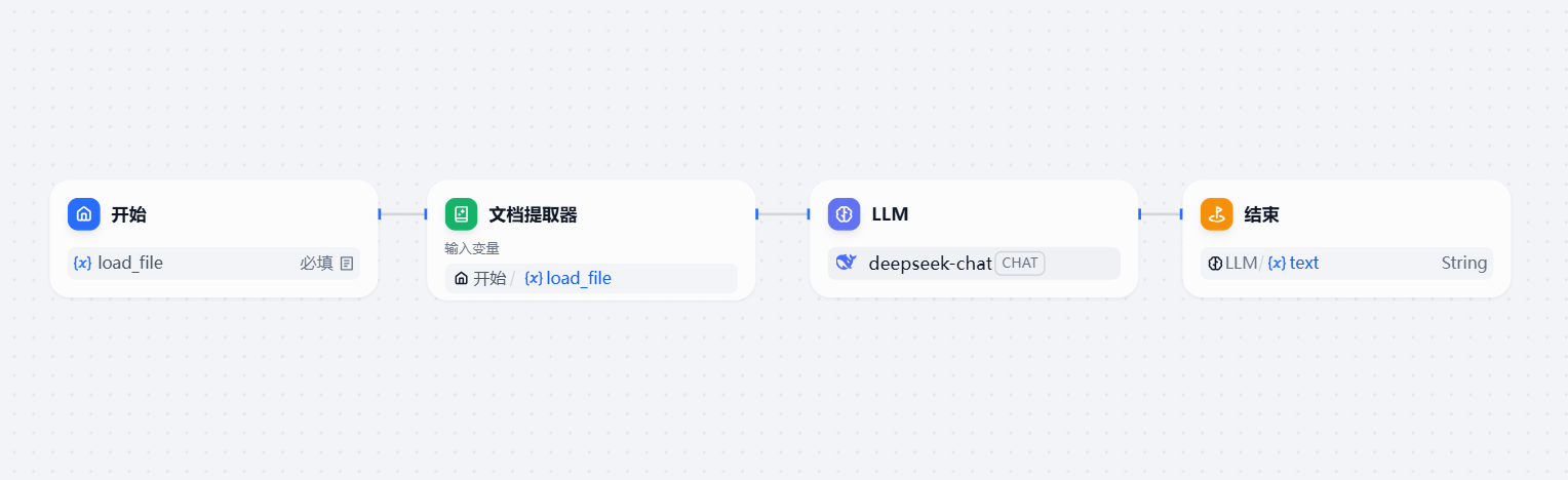 开始(导入PDF文档)-> 文档提取器(从文档中提取文本)->LLM(DeepSeek本地模型分析)-> 结束(输出结果)