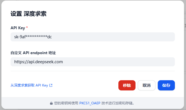 如果你想配置在线的DeepSeek官方模型,直接填写API地址和key即可,key需要你去DeepSeek官网申请。