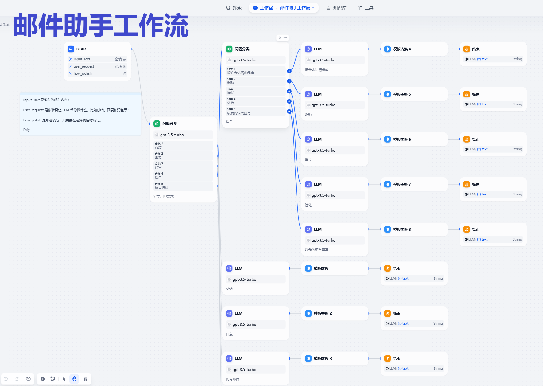这只是一个简单的流程,你可以设计一个更加复杂的工作流,Dify都能轻松实现。