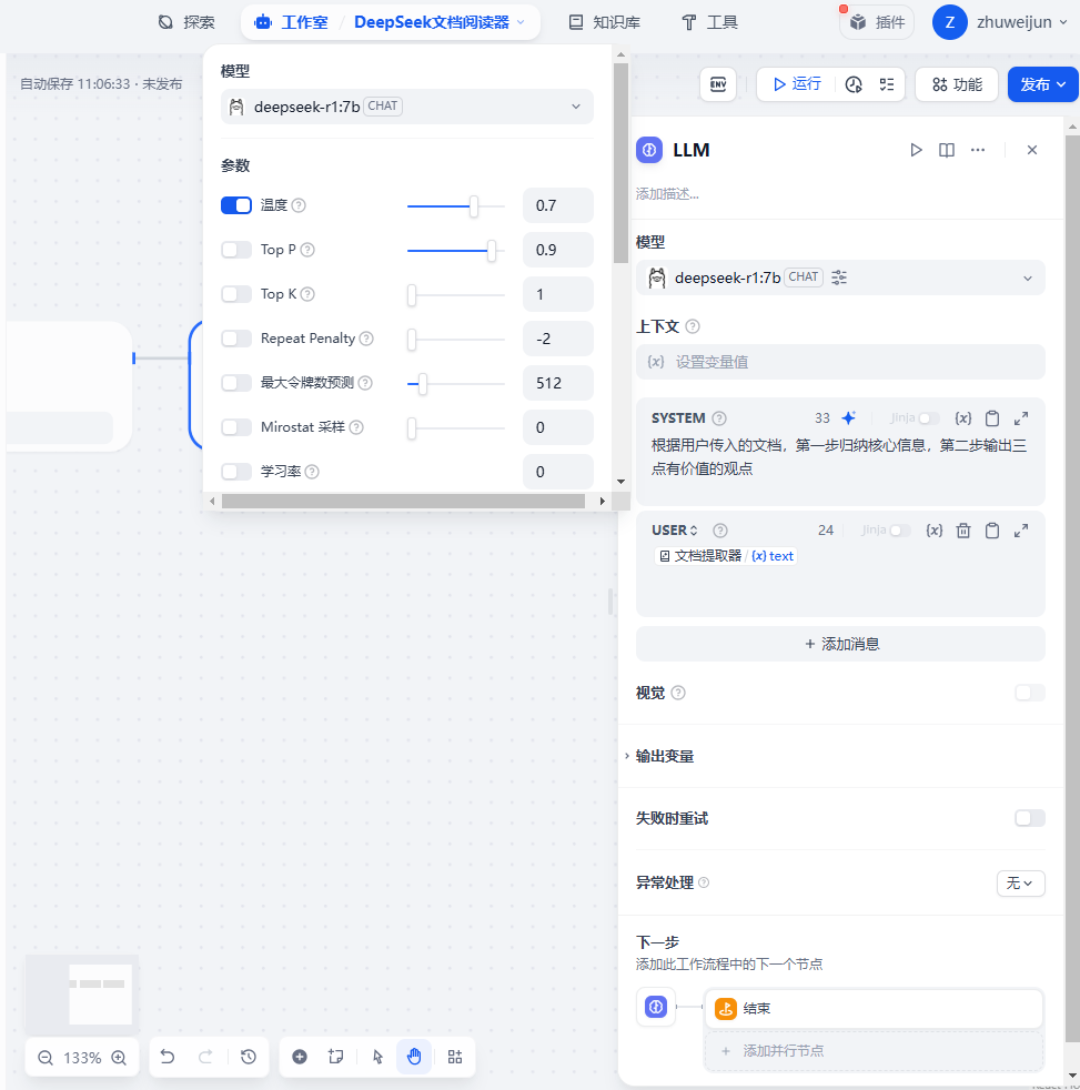其中LLM里面接入的是DeepSeek R1 7B模型,支持设置各种参数,比如温度、Top P、Top K等。