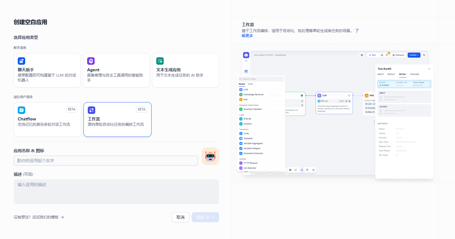想要搭建工作流,先在Dify首页新建一个空白工作流应用,填好名称信息。