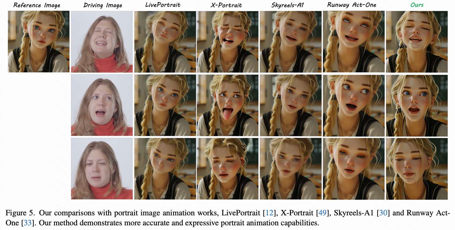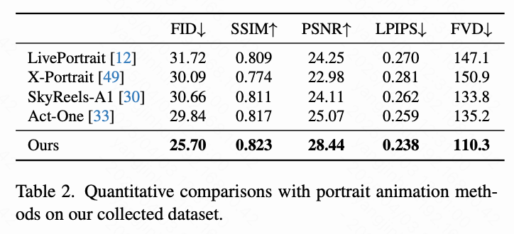 与肖像动画方法的比较。 本文还将DreamActor-M1与最先进的肖像动画方法进行比较,包括LivePortrait、XPortrait、SkyReels-A1和Act-One,如下表2和下图5所示。正如下表2所示,在本文收集的数据集上,视频驱动的结果在所有指标上始终优于所有竞争方法。