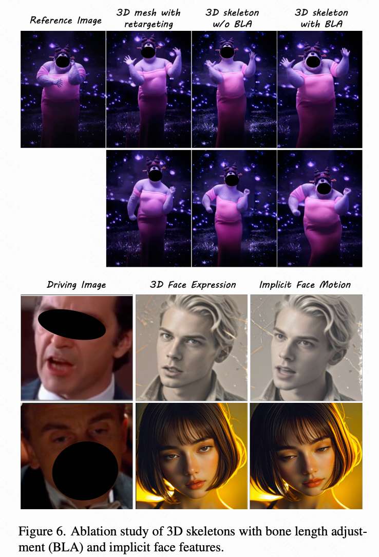 混合控制信号。 本文进一步通过消融关键组件来研究混合控制信号的贡献:(a)用3D网格替换3D头部球体和骨架,(b)用3D面部标志替换隐式面部表示。结果如下图6所示。这些设置下的显著性能下降强调了本文混合控制框架中每个组件的重要性。具体来说,具有骨长调整的3D骨架提供了更准确的空间指导,而隐式面部表示比传统标志更有效地捕捉细微的表情细节。这些发现证明了本文提出的混合控制信号在实现高质量和逼真人像动画方面的有效性和优越性。