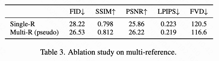 多参考协议。 本文比较了两种设置:(a)使用单个参考图像进行推理,(b)如前文所述的两阶段推理方法,首先生成伪参考图像,然后进行多参考推理。结果如下表3所示。它表明伪多参考推理在长时间视频生成质量和时间一致性方面优于单参考推理。这是因为在扩展的视频生成过程中,补充的参考图像提供了关于未见区域的额外视觉信息,使视频生成过程能够利用参考细节。这有助于避免信息丢失,从而在整个视频中保持一致性。然而,单个参考图像达到的性能仍然具有竞争力,表明它足以应对大多数场景。