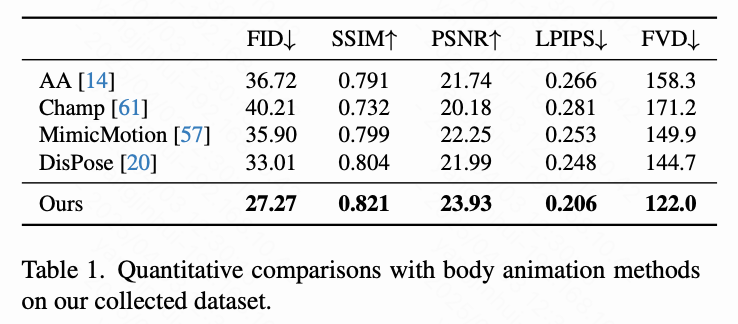 与身体动画方法的比较。 本文对DreamActor-M1进行了定性和定量评估,并与现有的身体动画方法进行比较,包括Animate Anyone、Champ、MimicMotion和DisPose,如下表1和下图4所示。本文可以看到,本文提出的DreamActor-M1优于当前的最新结果。