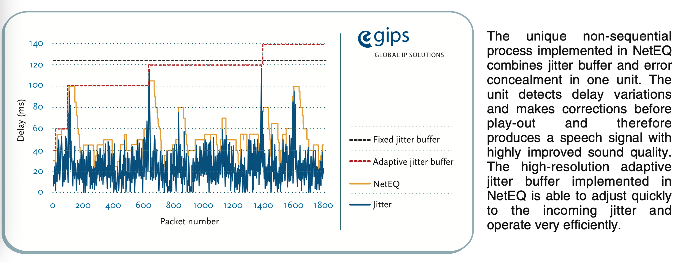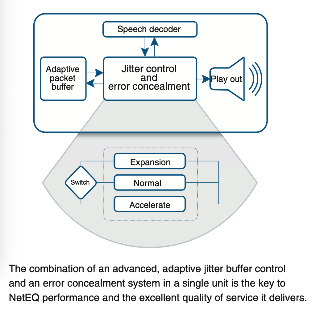 NetEq(Network Echo Canceler)作为WebRTC音频引擎的核心模块,是实时音视频通信的基石之一,旨在解决网络抖动、丢包和延迟问题,确保音频传输的稳定性和低延迟,并实现音频同步。其核心原理主要围绕抖动控制(Jitter Control)和丢包隐藏(Packet Loss Concealment, 又称为error concealment)展开,正如官网文档介绍(http://www.gipscorp.alcatrazconsulting.com/files/english/datasheets/NetEq.pdf),两者的结合是NetEq表现出色的关键: