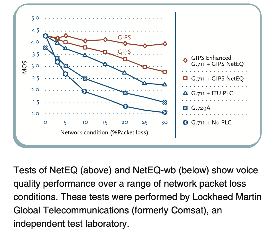 通过独立的评测机构的对比测试,可以发现NetEq对比传统的PLC,以及没有PLC时的音质表现(MOS),确实非常亮眼。
