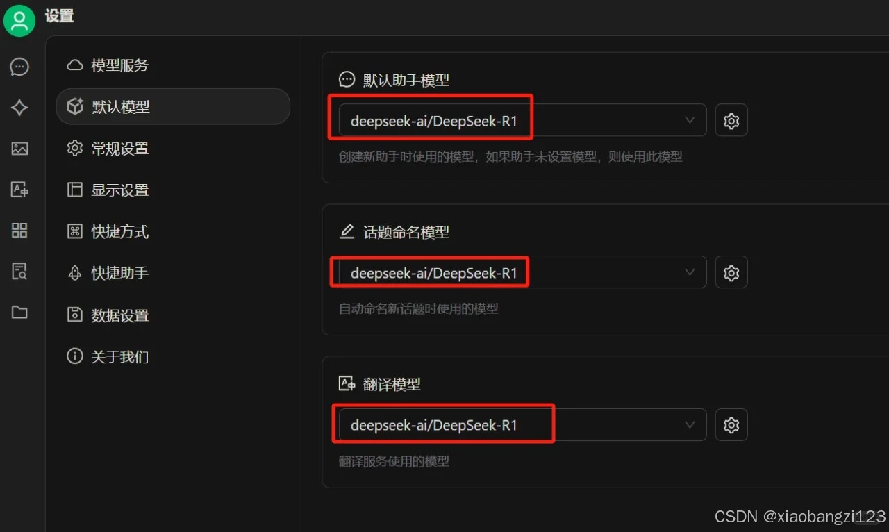 (2)设置 -默认模型 都可以选择 DeepSeek-R1