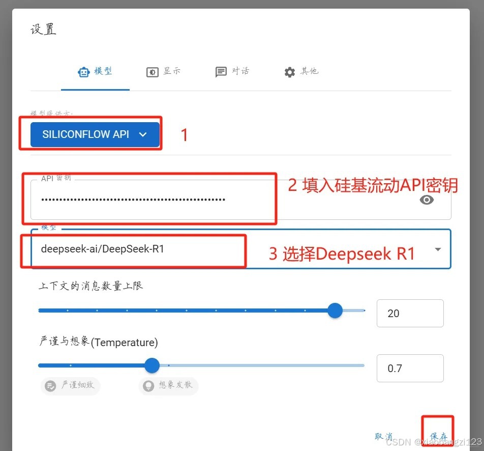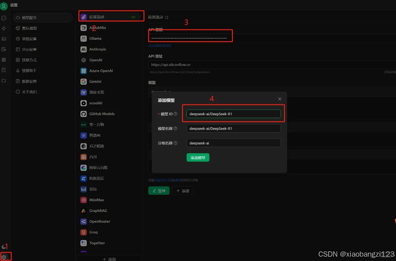 (1)设置-模型服务-填入硅基流动 API秘钥 添加模型 -模型ID 填deepseek-ai/DeepSeek-R1