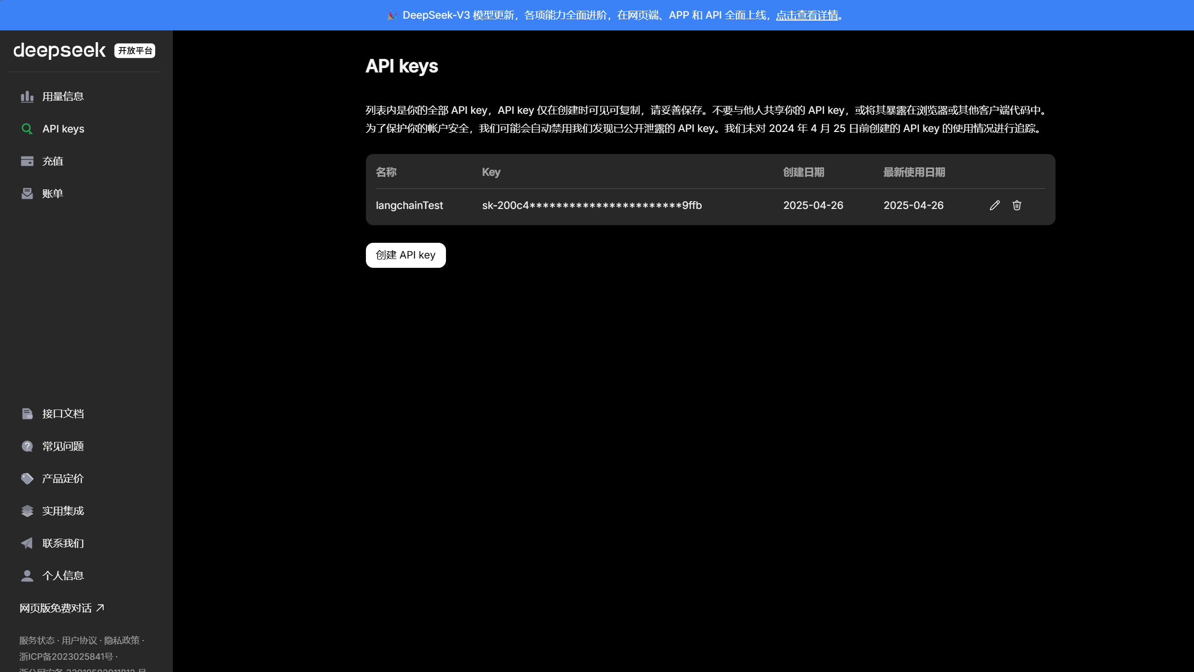 首先我们要先去deepseek官网上去获取相关配置信息DeepSeek 开放平台