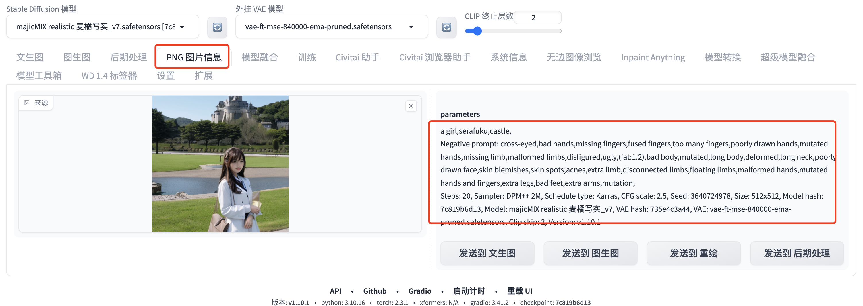 获取图片信息,可以快捷发送提示词和配置 生图。