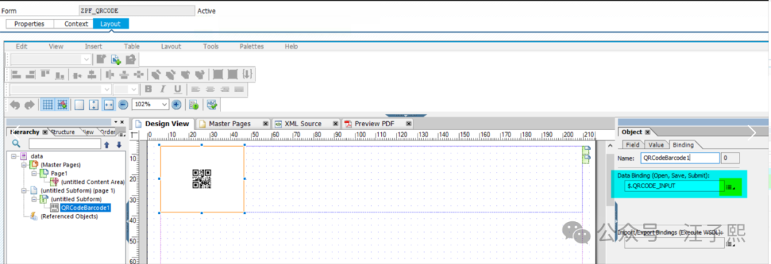 然后将用户指定要用来生成二维码的字符串内容,通过 ABAP Form Interface,传递到 Adobe Form Template 即可。通过数据绑定机制,在 Adobe Form 运行时生成 PDF 时,显示出的二维码,自然就嵌入了用户传递进来的字符串值。