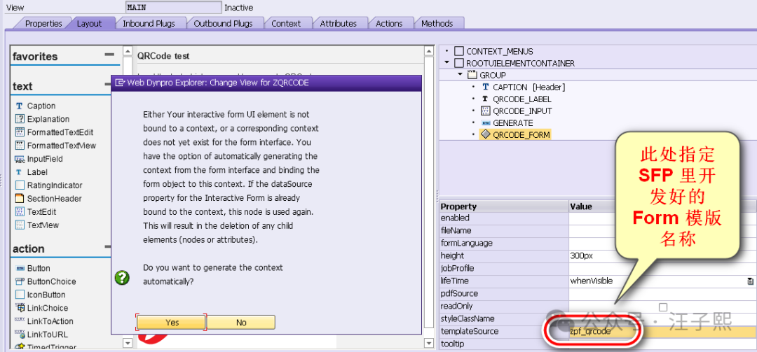 方法2 不需要 ABAP 编程工作,而仅仅是在 ABAP Webdynpro 里使用标准的 Interactive Form 控件,在这个控件里将我们在 SFP 事务码里制作好的包含了二维码的 Adobe Form Template 维护进去,如下图所示: