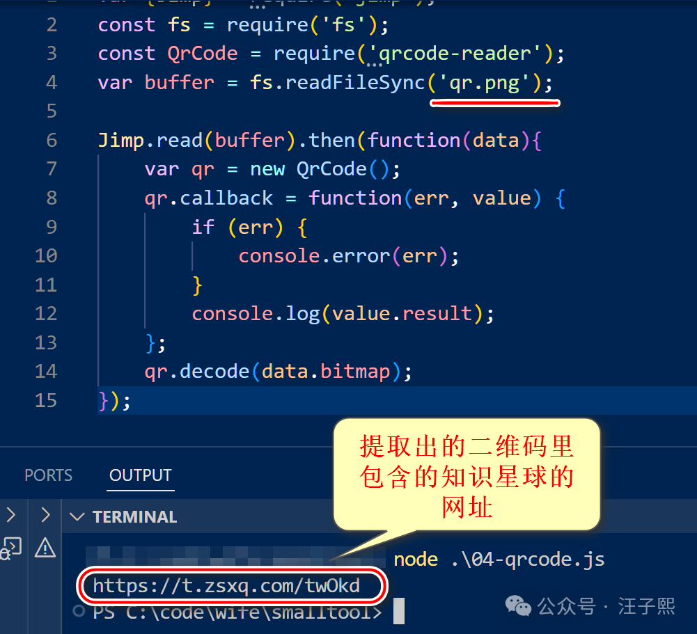 ChatGPT 建议使用 Jimp 来读取图片文件内容,用 qrcode-reader 来进行二维码解析。Node.js 生态圈的轮子太多了,我们采用拿来主义,不重复造轮子。